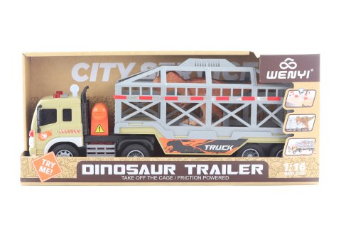 Prepravník s dinosaurom. Po stlačení tlačidiel vydáva zvuky a svieti. Rozmery cisterny cca 38,5 x 15 x 8 cm. Rozmery balenia cca 42 xc 11,5 x 18,5 cm. Napájanie na 3 AG13 batérie (sú súčasťou balenia). Vek 3+