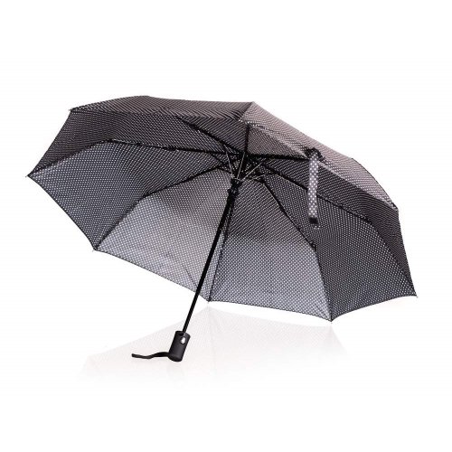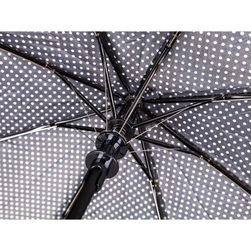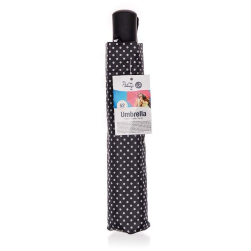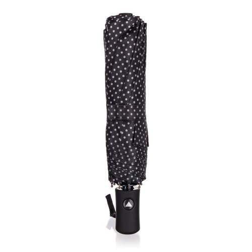 Dáždnik skladací 52 cm v čiernej farbe s bodkami, slúži na ochranu proti dažďu a priamemu slnku. Je vyrobený z nepremokavého materiálu polyester. Má ochranu proti poškodeniu vetrom, automatické otváranie a je skladacia pre ľahké uskladnenie.