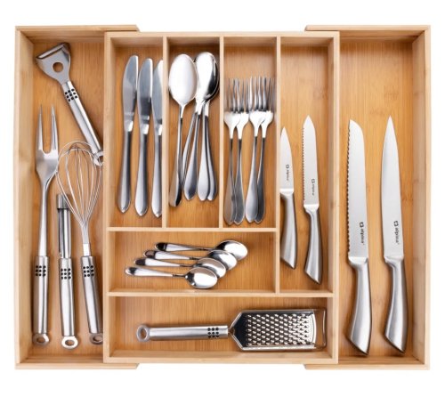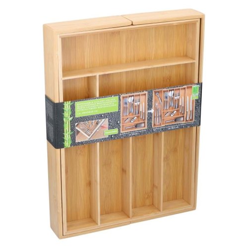 Výsuvný príborník – udržujte svoju kuchynskú zásuvku čistú a upratanú pomocou výsuvnej príborovej vložky . Príborník má rozmery 46 x 34 x 6 centimetrov. Pre väčšiu zásuvku na príbory môžete príborník rozšíriť na 46 x 56,5 x 6 centimetrov.6 až 8 priehradiek – pri nepoužívaní ponúka box na príbory 6 priehradiek na uloženie malých príborov, ako sú lyžice a nože. V plne rozloženom stave sú k dispozícii 2 ďalšie priehradky na veľké príbory, ako sú obracačky a nože na chlieb . Vyrobené zo 100% ekologického bambusového materiálu. Vďaka tomu je príborník veľmi trvanlivý a silný. Bambus sa okrem toho ľahko udržuje a vyzerá elegantne.
