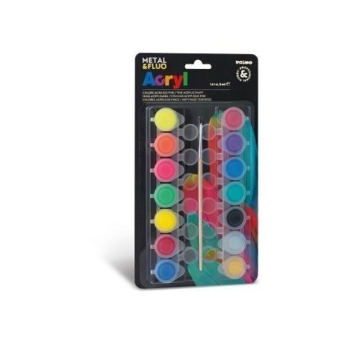 Akrylové farby Primo na akrylovej báze s vysokým obsahom pigmentu a výbornou krycou schopnosťou. Riaditeľné vodou. Vhodné pre akýkoľvek druh podkladu drevo, kov, keramiku alebo aj pre techniku decoupage-obrúskové techniky, sú nezmývateľné a odolné vode. Na blistri 14 odtieňov farieb po 4,5 ml v uzatvárateľnom tégliku s miešacou nádobkou pri každom odtieni. Hotový výrobok je nutné nechať zaschnúť min.24hodín . Po zaschnutí sú tony farieb krásne sýte a jasné. Odtiene sú medzi sebou ľahko miešateľné na vytvorenie širšej škály farieb. Farby po zaschnutí nie sú vyprateľné, treba odstrániť hneď teplou vodou a mydlom.