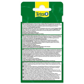 Tiež odolné štetinkovité a vlásočnicovité riasy budú spoľahlivo zneškodnené bez toho, aby sa ublížilo rybám alebo rastlinám. Dávkovanie: ako prevencia: aplikujte 1 tabletu na 50 l vody do blízkosti vzduchovacieho kameňa. Na odstránenie štetinkovitých a vlásočnicových rias: dvojité dávkovanie. Tablety v sebe majú uloženú účinnú látku, ktorá sa postupne uvoľňuje do akvária, ale nerozpúšťa sa a udržujú si svoj tvar. Po šiestich týždňoch už tablety žiadnu účinnú látku neobsahujú, a preto ich z akvária vyberte.