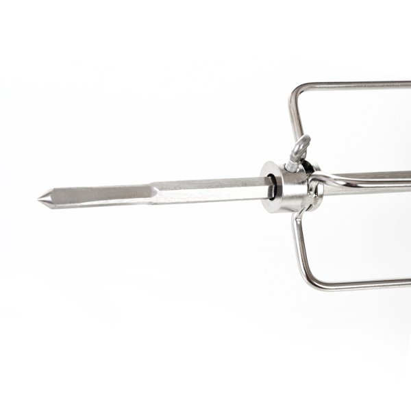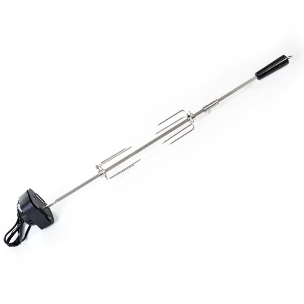 Z jednej strany je ihla vybavená odnímateľným plastovým držadlom , na ktorom je praktické očko na uchytenie. Z druhej strany sa nachádza motorček v plastovom kryte , na ktorom je umiestnené tlačidlo na zapínanie/vypínanie. Motorček s napätím 230 V jednoducho zapojíte do elektriny pomocou kábla v dĺžke cca 125 cm. Motorček s ihlou otáča rýchlosťou asi 2 otáčky za minútu, aby sa pripravovaný pokrm nepripekal, ale piekol sa rovnomerne.