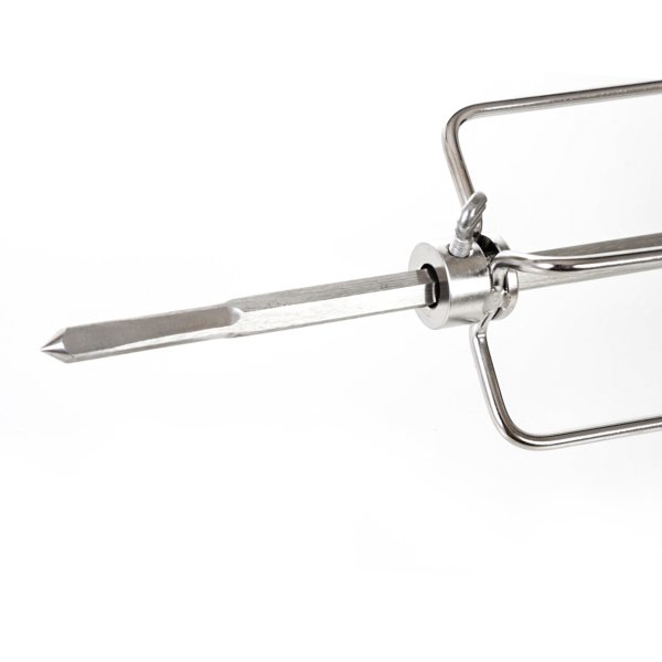 Z jednej strany je ihla vybavená odnímateľným plastovým držadlom , na ktorom je praktické očko na uchytenie. Z druhej strany sa nachádza motorček v plastovom kryte , na ktorom je umiestnené tlačidlo na zapínanie/vypínanie. Motorček s napätím 230 V jednoducho zapojíte do elektriny pomocou kábla v dĺžke cca 125 cm. Motorček s ihlou otáča rýchlosťou asi 2 otáčky za minútu, aby sa pripravovaný pokrm nepripekal, ale piekol sa rovnomerne.