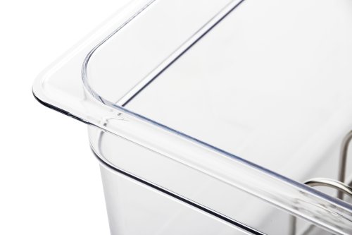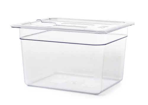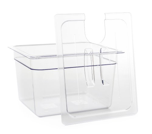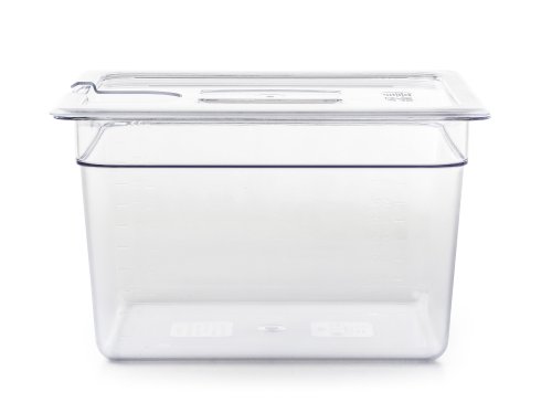 Nádoba G21 pre sous-vide varenie je vyrobená z vysoko odolného polykarbonátu a oproti kovovým hrncom efektívnejšie udržuje teplotu a zahriatie vodného kúpeľa trvá kratšiu dobu. Polykarbonát spĺňa najprísnejšie požiadavky na bezpečnosť a je zdravotne nezávadný. Vďaka vysokej stálosti použitého materiálu je možné nádobu umývať v umývačke riadu , čo vám ušetrí veľa času aj námahy s upratovaním. Ďalej je nádoba vybavená odnímateľnou pokrievkou s výrezom na sous-vide varič . Pokrievku však možno používať aj s varičom inej značky, pretože sa do otvoru zmestí väčšina varičov na trhu.