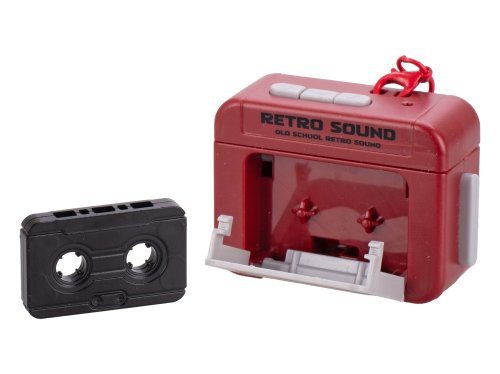 Prívesok na kľúče kazetový nahrávač na batérie s hudbou. Veľkosť 5,5cm. 2 varianty: modrá, červená, batéria 4xLR41, súčasťou