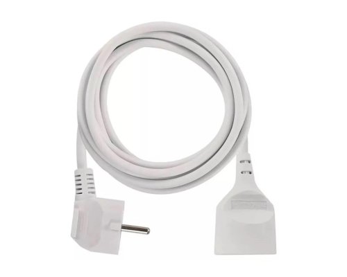 Predlžovací kábel bielej farby na vnútorné použitie. Zásuvka a vidlica sú vyrobené z plastu, kábel PVC.