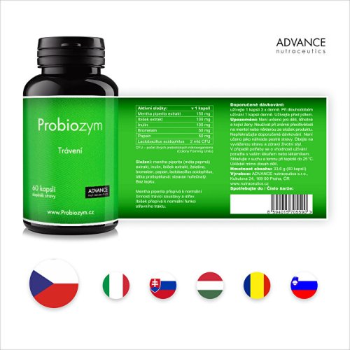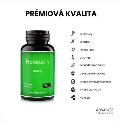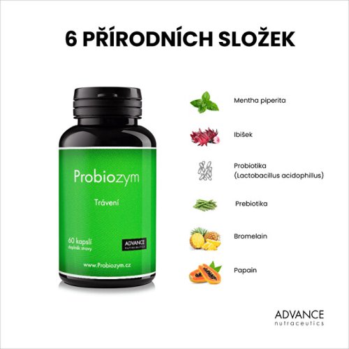 ADVANCE Probiozym obsahuje unikátnu kombináciu 6 látok, ktoré prispievajú k normálnej činnosti tráviacej sústavy a čriev a podporujú tak trávenie a zažívanie. Neobsahuje laktózu, mliečnu bielkovinu ani lepok.