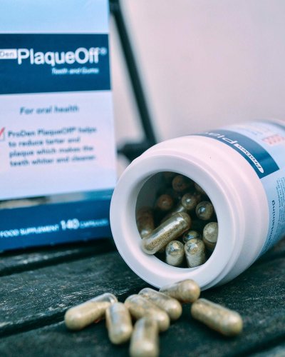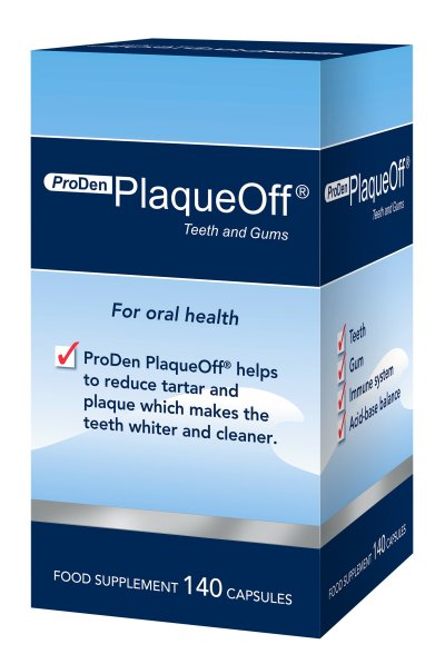 Pre Deň PlaqueOff® Teeth and Gums je patentovaný, 100% prírodný doplnok stravy pre ľudí, ktorý pomáha odstraňovať zubný kameň a zubný povlak, čím zuby bieli a čistí, a napomáha tak udržiavať zdravie zubov a ústnej dutiny. Na rozdiel od iných metód starostlivosti o zuby Pro Deň PlaqueOff® Teeth and Gums funguje systémovo, tj prostredníctvom krvného obehu. Zlepšenia sú obvykle pozorované počas piatich až ôsmich týždňov. Prieskumy ukazujú, že u 75 % dospelých ľudí, ktorí si čistia zuby dvakrát denne, je na zuboch stále viditeľný zubný povlak. Jednoducho užívajte dve tablety denne! Produkt je vo forme ľahko prehltnuteľných kapsúl, ktoré obsahujú dôležité vitamíny a minerálne látky a sú bez umelých farbív, konzervačných látok, lepku a cukru.