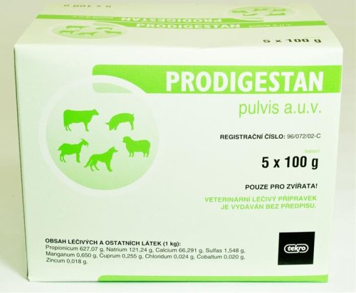 Registračné číslo SR 96/072/02-C Príznak preskripcie SR VP ATC skupina Q01JA Registračný názov + forma PRODIGESTAN plv. ad us. vet. Výrobca Tekro sro ., Praha, ČR. Držiteľ reg. rozhodnutia Tekro sro ., Praha, ČR. Zloženie - účinné látky Natri propionás 506,6 mg, Calcii propionas 308 mg, Mangáni sulfas, monohydricus 2 mg, Cupri sulfas pentahydricus 1 mg, Cobaltosi chloridum, hexahydricum 0,08 mg, Zinci sulfas heptahydricus 0,08 mg - pomocné látky Lactosum monohydricum. Popis prípravku Biely až žltkastý hydroskopický prášok. Druh obalu Vrecko z fólie Alufan PE, balené jednotlivo alebo po 5 kusoch do kartónovej, škatule. Papierové vrece s PE vložkou alebo plastové vedierko. Balenie 5 x 100 g, 5 kg, 10 kg, 25 kg. Indikačná skupina Veterinaria - pharmaceutica, stomachikum, ruminatórium. Charakteristika Soli kyseliny propiónovej majú u prežúvavcov funkciu hlavného prekurzora, glukózy. Kobalt má významné postavenie najmä u prežúvavcov. Ako súčasť vitamínu,B12 je potrebný pre erytropoézu a má u prežúvavcov širšie metabolické,využitie. Mangán okrem principiálnej funkcie pri tvorbe komponentov chrupavky má, špecifický účinok ako kofaktor enzýmu glykozyl - transferázy. Zinok je súčasťou radu enzýmov ako sú anhydráza kyseliny uhličitej a alkalickej fosfatázy. Zinok je potrebný predovšetkým pre syntézu RNA, a normálny rast a obnova tkanív. Meď je podstatnou zložkou mnoho systémov v tele. Je integrálnou súčasťou, nevyhnutných enzýmov ako je cytochróm oxydáza a radu enzýmov metabolizujúcich, aminokyselín. Sírany pôsobia adstringentne na zápalovú sliznicu predžalúdkov, zúžením, ciev pôsobia protizápalovo, na stenu predžalúdkov, vytvárajú ochranný film, koagulovaných proteínov. Farmakokinetické údaje Liek je určený na lokálne pôsobenie v tráviacom trakte, pri čiastočnej, resorpcii niektorých zložiek dochádza k ich metabolizácii v pečeni a enterocytoch. Indikácie / použitie Cieľový druh zvierat: hovädzí dobytok, ovce, kozy, ošípané, psy. Gastrointestinálna dysfunkcia u prežúvavcov vznikajúce z nadmerného prívodu, ľahko stráviteľných glycídov, pri náhlej zmene kŕmnej dávky a pri nadmernom, skrmovaní bielkovinových koncentrátov, pri nevyhovujúcej štruktúre krmív (malá, veľkosť častíc), v počiatočnom stave. Jednoduchá indigescia, atónia bachora, intoxikácia z krmiva. Zápaly, gastrointestinálneho traktu prežúvavcov, ošípaných. Primárna acetonémia, ketonúria, hypoglykémia. Podporná terapia pri steatóze pečene, otrave amoniakom, popôrodnej paréze, špecifických a nešpecifických črevných zápaloch, sepse a teplote, anorexii spojenej s hnačkou alebo zápchou, chudnutí a spomalení rastu, pohybových poruchách a teplote, nedostatku minerálnych látok dehydratačných stavoch, rachitíde, u psov pri proktokolitíde. Kontraindikácie Nepriechodnosť tráviacej trubice pri podávaní lieku sondou. Nežiaduce účinky Nie sú známe. Upozornenie U hovädzieho dobytka v priebehu liečby odporúča diéta s vyšším obsahom sena, a okopanín. Jadrové krmivo z kŕmnej dávky vylúčiť a postupne pridávať po zlepšení zdravotného stavu. Dávkovanie Dospelý dobytok 2-krát denne 100-150 g počas 2-5 dní, ošípané 2-krát denne, 20-25 g počas 2-5 dní, psy 2-krát denne 5 g počas 2-5 dní. U ostatných zvierat sú dávky úmerné menšie podľa hmotnosti. 1 zarovnaná polievková lyžica obsahuje 6-7 g prášku. Spôsob použitia Dobre rozpustený prášok v teplom nápoji (vode, harmančekovom čaji) u hovädzieho dobytka, pažerákovou sondou priamo do bachora alebo z fľaše do ústnej dutiny, prípadne, zamiešaný v krmive, u ošípaných a psov z fľaše do ústnej dutiny, prípadne, zamiešaný . Ochranná lehota veterinárna Bez ochranných lehôt. Použitie, expirácia 24, po prvom otvorení 15 týždňov, po rozpustení vo vode alebo zamiešaní do,krmivá ihneď spotrebovať. Spôsob skladovania Pri teplote do 25 st. C, v suchu. Dátum spracovania 18.10.2010 Autor článku Podľa SPC.