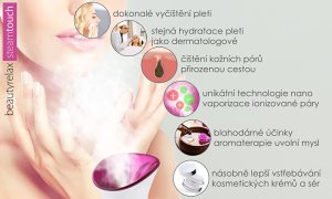 Profesionálny kozmetický prístroj na čistenie pleti Steamtouch dokonale a hĺbkovo vyčistí zanešené kožné póry. Disponuje unikátnou technológiou nano vaporizácie. Negatívna ionizácia slúži na násobne lepšie vstrebávanie kozmetických krémov a sér.