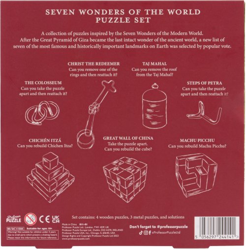 Kolekcia Lost +amp; Found: Ponorte sa do minulosti s touto sériou hlavolamov inšpirovaných starovekými civilizáciami a odhaľte príbehy ukryté v každom z nich! Sedem divov. Sedem výziev. Rozlož a zlož zázraky sveta! Hlavolamy inšpirované najikonickejšími stavbami modernej doby. Balenie obsahuje: 3x kovový hlavolam, 4x drevený hlavolam a pergamen s riešením. Poznámka: Riešenie je v anglickom jazyku.