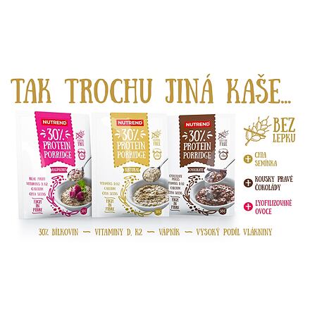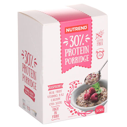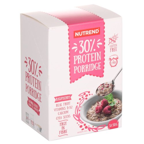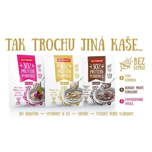 Lahodná proteínová ovsená kaša, ktorá obsahuje 30% mimoriadne kvalitné bielkoviny (mliečny proteínový izolát), je bohatá na vlákninu, bezlepková a ľahko stráviteľná. Tým však zoznam jej benefitov zďaleka nekončí - obsahuje vápnik, vitamín K aj tak potrebný vitamín D. Stačí iba zaliať vodou a za 2 minúty je kaša hotová. Proteínová ovsená kaša sa stáva jednou z najobľúbenejších možností rýchlo pripravených raňajok, ale aj vyhľadávanou formou desiaty v priebehu dňa. Vhodná kombinácia živín vás nielen nasýti, ale dodá vhodný pomer všetkých živín. Proteín Porridge od spoločnosti Nutrend je bohatá na vlákninu a obsahuje výhradne bezlepkové suroviny, vďaka ktorým je ľahko stráviteľná. Vďaka tejto kaši dodáte svojmu telu veľké množstvo bielkoviny, ktorej zdrojom je vysoko kvalitný mliečny proteín (izolát). PROTEIN PORRIDGE od spoločnosti Nutrend je ďalej bohatá na chia semienka a dodá vášmu telu unikátnu zmes vitamínov a minerálov, medzi ktorými nájdete najmä vitamín D a vitamín K, a ďalej tiež vysoké množstvo vápnika. - 30% bielkoviny (mliečny proteínový izolát) - dostatočné množstvo bielkoviny prispieva k syntéze a udržiavaniu svalovej hmoty - bez lepku - Vitamín D - prispieva k udržaniu normálnych kostí a zubov, prispieva k absorpcii vápnika a fosforu, prispieva - prispieva k normálnej zrážanlivosti krvi, prispieva k udržaniu normálnych kostí - Vápnik - potrebný pre normálny rast a vývoj kostí a zubov, prispieva k normálnej svalovej funkcii Odporúčané dávkovanie: Dávka 50 g je vhodná ako raňajky alebo olovrant v dopoludňajších aj popoludňajších hodinách, vždy s odstupom minimálne 90 minút od ďalšej bežnej stravy. Možno užiť aj po fyzickej aktivite. Maximálne 2 dávky denne. Použitie: 50 g = jedna porcia. Obsah vrecka vysypte do vhodnej nádoby, zalejte 100 ml horúcej (nie vriacej) vody a rozmiešajte. Možno použiť aj studenú vodu. Po otvorení vrecka je výrobok určený na okamžitú spotrebu. Upozornenie: Proteínová kaša obohatená o vitamíny. Nie je určené pre deti do 3 rokov. Ukladajte mimo dosahu detí. Skladujte v suchu pri teplote do 25 ° C mimo dosahu priameho slnečného žiarenia. Chráňte pred mrazom. Výrobca neručí za prípadné škody vzniknuté nevhodným použitím alebo skladovaním. Príchuť malina: bezlepkové ovsené vločky 33,5 %, izolát mliečnych bielkovín, trstinový cukor, pohánková kaša 5 %, chia semienka (Salvia hispanica) 5 %, inulín, ryžová múka, fruktóza, lyofilizované maliny 2 , regulátor kyslosti kyselina citrónová, chlorid sodný, protispekavé látky fosforečnan vápenatý a oxid kremičitý, menachinón - 7 (vitamín K2), cholekalciferol (vitamín D). Môže obsahovať stopy sóje. Príchuť čokoláda: bezlepkové ovsené vločky 32 %, izolát mliečnych bielkovín, trstinový cukor, pohánková kaša 5 %, chia semienka (Salvia hispanica) 5 %, inulín, ryžová múka, fruktóza, horké čokoládové kúsky 2 kakaové maslo, emulgátor slnečnicový lecitín), kakao, akáciová guma, aróma, chlorid sodný, protispekavé látky fosforečnan vápenatý a oxid kremičitý, menachinón - 7 (vitamín K2), cholekalciferol (vitamín D). Môže obsahovať stopy sóje.