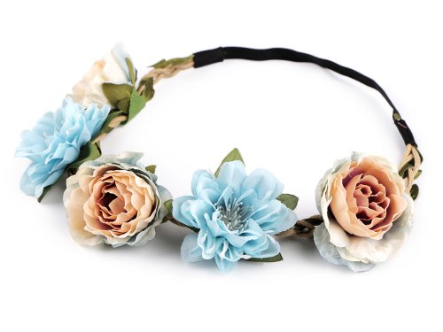 Čelenka s kvetmi romanticky ozdobí váš účes. Kvety sú jemné, niektoré v strede ozdobené pestíkmi. Sú pripevnené k vrkôčiku z voskovaných šnúrok. Do vrkôčiku je vpletený prámik s lístočkami. Zadnú časť tvorí pružná guma. Vďaka nej čelenka pevne drží a nepadá, je veľmi príjemná na nosenie. Celkový obvod čelenky je 52 cm v nenatiahnutom stave.