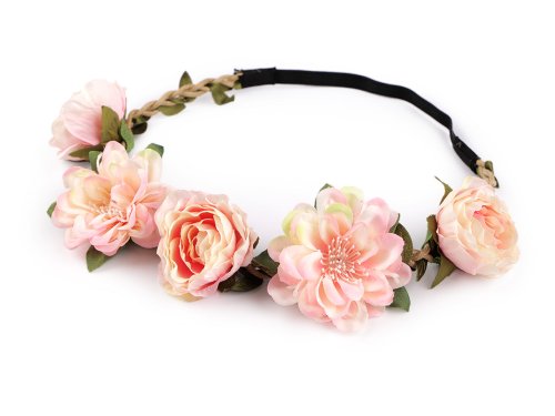 Čelenka s kvetmi romanticky ozdobí váš účes. Kvety sú jemné, niektoré v strede ozdobené pestíkmi. Sú pripevnené k vrkôčiku z voskovaných šnúrok. Do vrkôčiku je vpletený prámik s lístočkami. Zadnú časť tvorí pružná guma. Vďaka nej čelenka pevne drží a nepadá, je veľmi príjemná na nosenie. Celkový obvod čelenky je 52 cm v nenatiahnutom stave.