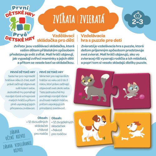 Hra obsahuje: 12 dvojdielnych skladačiek a návod pre rodičov. Edícia Prvé detské hry od výrobcu TREFL sú ideálne pre hráčov vo veku 2-3 rokov, ktorí začínajú objavovať svet okolo seba. Jednotlivé hry pomáhajú rozvíjať rôzne schopnosti malých hráčov a pritom plne uspokojujú ich prirodzenú zvedavosť.