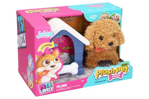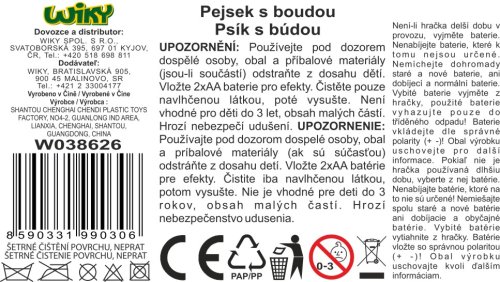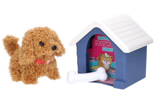 Psík s búdou. Veľkosť psíka 15cm. Veľkosť búdy 16cm. Obsahuje búdu, psíka, kosť. 2xAA batérie nie sú súčasťou.