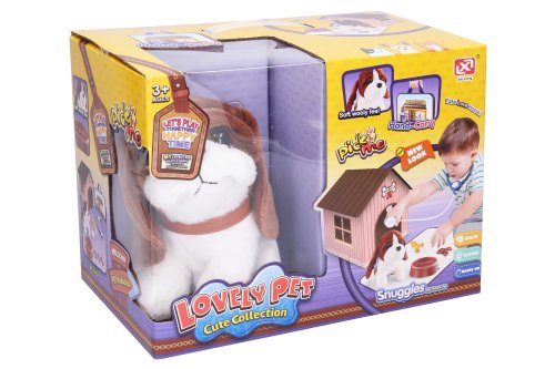 Psík s búdou a taštičkou. Veľkosť psíka 18 cm. Balenie obsahuje plyšového psíka, tašku s doplnkami a búdu na zloženie. Návod na krabici. Doplnky: miska, injekcia, stetoskop, maškrty.