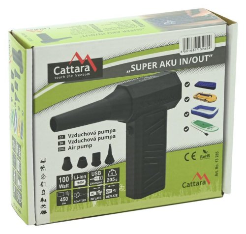 Hlavné prednostiPumpa Cattara SUPER AKU je navrhnutá tak, aby zvládla širokú škálu úloh. S priloženými nástavcami hravo nafúknete i vyfúknete matrace, člny, paddleboardy alebo bazény. Vďaka motoru, ktorý dosahuje až 100 000 otáčok za minútu, však prístroj slúži aj ako účinný ofukovač. Ľahko tak vyčistíte klávesnicu počítača, vnútro elektroniky alebo vyfúkate prach z ťažko prístupných miest v aute.