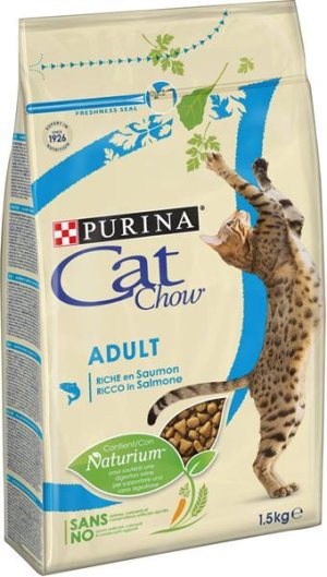 Kompletná a vyvážená výživa s vysokým podielom lososa poskytne vašej mačke všetko, čo potrebuje pre svoj úžasný život. Už od roku 1926 odborníci spoločnosti PURINA spájajú porozumenie prirodzeným požiadavkám zvierat s prípravou správnej výživy, aby mohli prispieť k ich celkovému zdraviu a pohode. Naša receptúra s vysokým podielom morky a špecificky vybranými kvalitnými zdrojmi bielkovín uspokojí prirodzené potreby mačky. Starostlivo pripravené krmivo s prírodnými zložkami (petržlen, špenát, mrkva, celozrnné obilniny, čakanka a kvasnice) v chutnej receptúre mačky spontánne preferujú. PURINA CAT CHOW NaturiumTM je receptúra so špecifickou kombináciou vlákniny z prírodných zdrojov. Obsahuje prírodné zdroje prebiotík, ktoré preukázateľne zlepšujú rovnováhu črevnej mikroflóry a podporujú zdravie tráviaceho traktu, aby mačka mohla získať zo svojej stravy čo najviac. Vitamín E podporuje prirodzenú obranyschopnosť mačky a vitamíny skupiny B jej pomáhajú účinne využívať energiu. Starostlivo pripravená receptúra: NEOBSAHUJE pridané umelé dochucovadlá NEOBSAHUJE pridané farbivá NEOBSAHUJE pridané umelé konzervačné látky Zloženie: obilniny (44 % celozrnné ), mäso a živočíšne produkty (15 %), bielkovinové extrakty, ryby** a tuky, vedľajšie produkty rastlinného pôvodu (2,7 % sušená repná dužina, 0,07 % sušená petržlen zodpovedajúca 0,4 % petržlenu ), zelenina* (2 % sušený koreň čakanky, 0,07 % sušená mrkva zodpovedajúca 0,4 % mrkvy, 0,07 % sušený špenát zodpovedajúci 0,4 % špenátu), minerálne látky, kvasnice* (0,3 %).