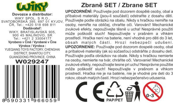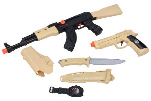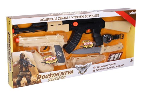 Puška sada púštne bitka. Obsah balenia - samopal 52 cm, pištoľ s puzdrom 20 cm, nôž s puzdrom 25 cm, hodinky. Samopal a pištole vydávajú akustické zvuky pri stlačení spúšte, bez batérií. Samopal sa nabíja páčkou na ľavej strane.