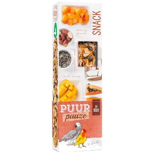 Witte Molen PUUR – skutočný pôžitok z rýdzich prírodných chutí a vôní. PUUR pauze Sticks lovebird &parrot sú lahodné tyčinky pre veľké papagáje a agapornisy plné prírodných chutných zložiek pre skutočný gurmánsky pôžitok. Chrumkavé tyčinky podnietia aktivitu vtákov, zabavia ich a zaženú nudu. Bohato vrstvené tyčinky s arašidmi, papájou, slnečnicovými semenami, marhuľami a kokosom. Vyrobené v Holandsku v spoločnosti Witte Molen s tradíciou od roku 1740. Zloženie: Zrná, semienka (28,7 % slnečnicové semienka), orechy (4 % kokos, 2 % arašidy), ovocie (1,5 % marhuľa, 1,5 % papája, 1,5% mango).