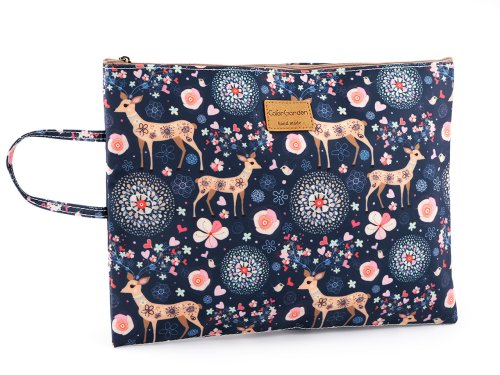 Veľké púzdro z nepremokavého materiálu je veľmi kvalitné a atraktívne. Má krásne spracované detaily ako je semišový štítok hand made na prednej strane a kovový prívesok medvedíka na zipse. Puzdro je ploché, hodí sa na skicáky, bloky, zošity, školské potreby, výkresy, dá sa do neho uložiť laptop a tablet. Presne sa do neho zmestí veľkosť formátu A4 - 210 x 297 mm. Vnútri má puzdro podšívku, ktorá má tiež pútavý potlač. Zapína sa na zips, jeho súčasťou je pútko na zavesenie.