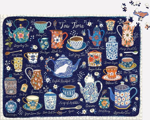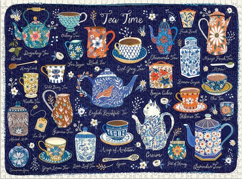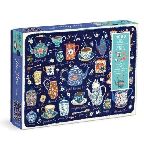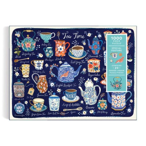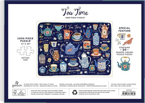 Puzzle obsahuje množstvo prvkov na prípravu čaju, ako sú čajové kanvice, podšálky a lyžičky. Toto puzzle obsahuje aj 20 špeciálne tvarovaných dielikov. Puzzle je balené v pevnej krabici, na opätovné použitie a skladovanie. Ideálne ako darček. Autorom obrázku je Christine de Carvahlo.Rozmery balenia: 29,2 x 21,6 x 5,1 cmRozmer puzzle: 68,6 x 50,8 cmVek: 8+Materiál: recyklovaný papier a kartónPočet dielikov: 1000 ks