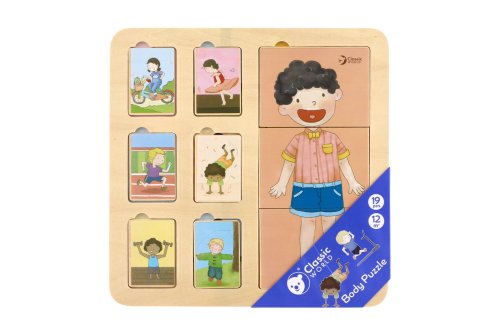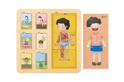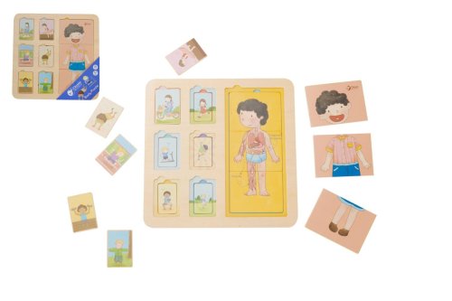 Puzzle ľudské telo má tri vrstvy. Zobrazuje štruktúru tela zo svalov, orgánov a kostí. Deti majú možnosť preskúmať ľudské telo. Puzzle obsahuje 19 drevených dielov (vrátane podložky). Rozmer podložky: 30 x 30 cm Vhodné pre deti od 12 mesiacov
