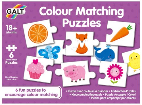 Sada šiestich farebných tematických puzzle pre veľmi malé deti. Každé puzzle sa skladá z troch dielikov a pomôže pri nácviku poznávania farieb známych predmetov a zvieratiek a pri rozvoji zručností, ako je párovanie a triedenie. Ideálne prvé puzzle obsahujúce menej dielikov, ktoré sa rýchlo skladá. Rozmery puzzle: 7 x 24 cm, každé puzzle má 3 dieliky