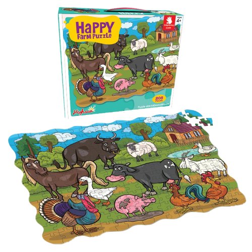 Puzzle šťastná farma ponúka deťom kreatívnu a múdru zábavu. Z 208 veľkých dielikov si poskladajú obrázok farmy vrátane farmára a jeho domácich zvierat. Pritom si budú rozvíjať fantáziu, priestorovú predstavivosť, trpezlivosť a jemnú motoriku. Skladačka je ideálna pre deti od 4 rokov. Všetky časti sú z pevnej lepenky. Poskladaný obrázok meria 64 x 90 cm.