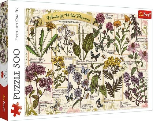 Puzzle - Herbarium: Liečivé byliny. Počet dielikov: 500 Rozmer zloženého puzzle: 48 x 34 cm Rozmer balenia: 27 x 40 x 4,5 cm