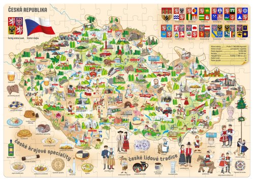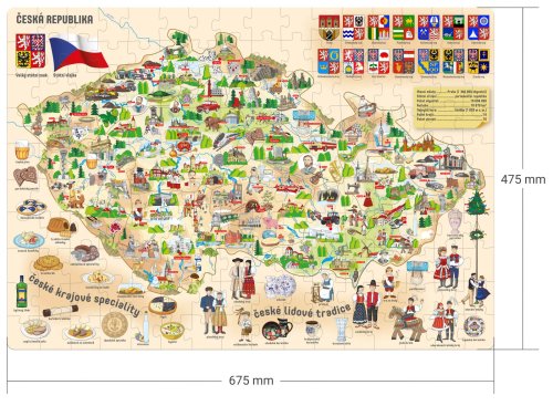 Milujete cestovanie a skladanie puzzle? Potom je táto mapa Českej republiky presne pre vás. Zemepisné puzzle pre deti s mapou našej republiky a ilustráciami v podobe pamiatok a turistov vyhľadávaných miest. Puzzle vám pomôžu naučiť sa aké pamätihodnosti, stavby či prírodné útvary tu nájdu. Obrázky od českého výtvarníka. Počet dielikov: 160 ks. Rozmer výrobku: 67,5x 47,5 cm. Rozmer balenia: 31x22,5x7 cm. Vek: 3+