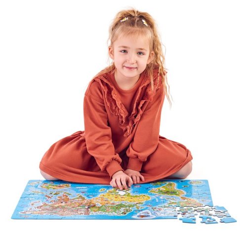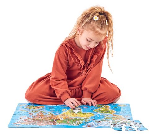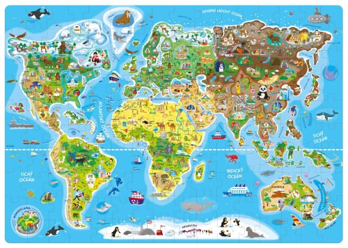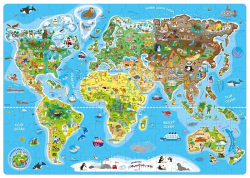 Milujete cestovanie a skladanie puzzle? Potom je táto mapa sveta presne pre vás. Zemepisné puzzle pre deti s mapou sveta a ilustráciami v podobe svetových pamiatok a turistov vyhľadávaných miest. Puzzle vám pomôžu naučiť sa aké zvieratá v daných oblastiach žijú, aké pamätihodnosti, stavby či prírodné útvary tu nájdu. Na puzzle nájdete Eiffelovku, pyramídy alebo napríklad sochu Slobody. Obrázky od českého výtvarného ka. Počet dielikov: 160 ks. Rozmer výrobku: 67,5x 47,5 cm. Rozmer balenia: 31x22,5x7 cm. Vek: 3+