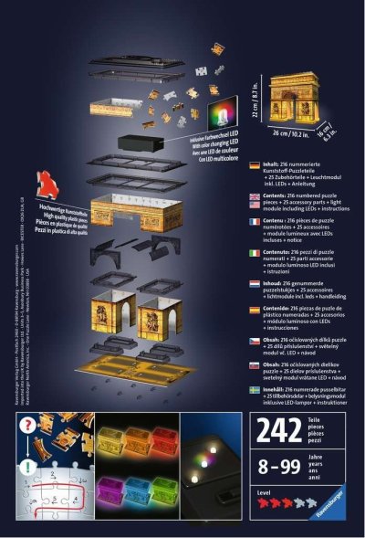 Nočná edícia slávneho Víťazného oblúka! Stavba z výroby nemeckej spoločnosti RAVENSBURGER sa vďaka LED svetlu v tme farebne rozžiari. Nočný Víťazný oblúk je skvelým darčekom aj nevšedným kúskom v 3D rozmere. Špeciálne ohybné dieliky, ktoré vďaka technológii EASYCLICK presne zapadnú na svoje miesto, umožňujú postaviť fascinujúci model dominanty Paríža. Dieliky vyrobené z pevného plastu zaručia vynikajúcu stabilitu a celá stavba drží bez nutnosti lepenia. Vďaka originálnym doplnkovým dielikom budú vašu stavbu všetci obdivovať. Balenie obsahuje: 216 očíslovaných dielikov puzzle, 25 dielov príslušenstva, svetelný modul vrátane LED a návod. Batérie 3x AAA nie sú súčasťou výrobku. Víťazný oblúk v Paríži (celým francúzskym názvom Arc de Triomphe de l'Étoile alebo len Arc de Triomphe) je víťazný oblúk, ktorý dal postaviť Napoleon Bonaparte na pamäť svojho víťazstva v bitke pri Slavkove. Viac na Wikipédii Rozmer zloženého puzzle cca 22x 26 x 16 cm