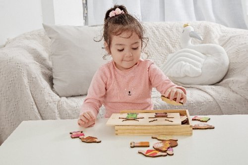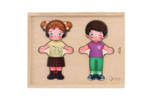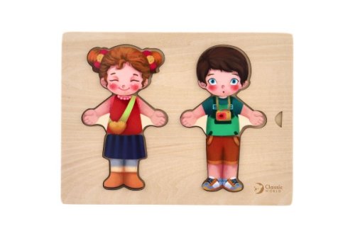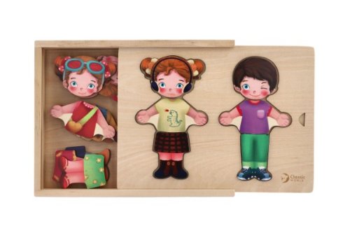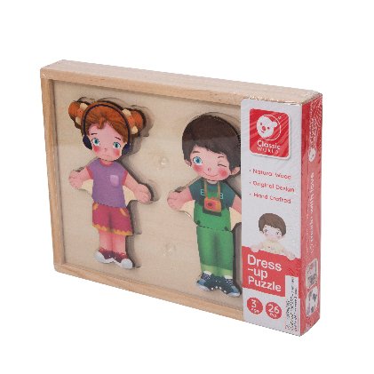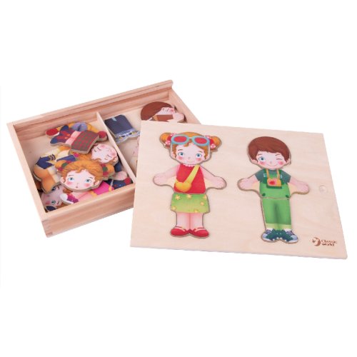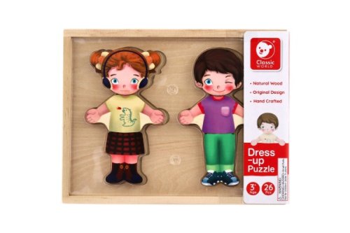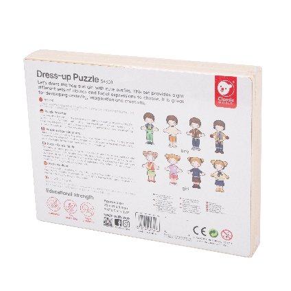 Detské baby puzzle ako šatník. Kompletný šatník - oblečte dievčatko alebo chlapčeka podľa svojho vkusu! Pre každú príležitosť iné ošatenie, iné tváre, veľa možností na kombinovanie! Balenie obsahuje 26 ks. Vkladajte, kombinujte, skladajte. Vyrobené z kvalitného dreva. Rozmery balenia 25 x 19 x 4 cm. Vhodné pre deti od 3 rokov.