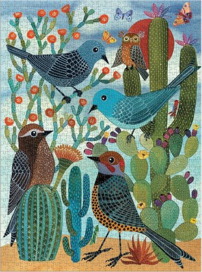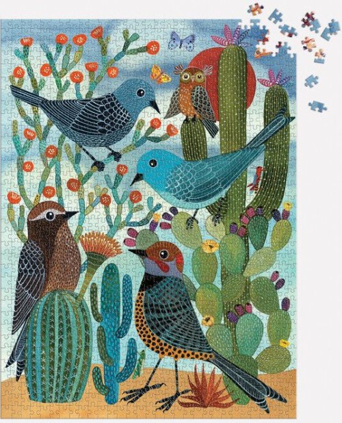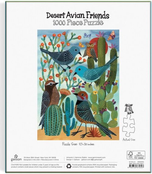 Puzzle obsahuje úžasné obrázky vtákov v slnečnej juhozápadnej púšti. Puzzle je balené v pevnej krabici, na opätovné použitie a skladovanie. Ideálne ako darček. Autorom obrázku je Geninne Zlatkis. Rozmery balenia: 28,6 x 21 x 5,1 cm Rozmer puzzle: 50,8 x 68,6 cm Vek: 8+ Materiál: recyklovaný papier a kartón Počet dielikov: 1000 ks