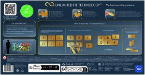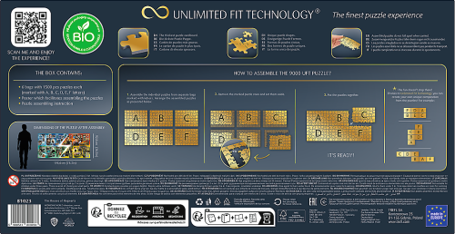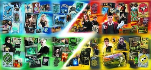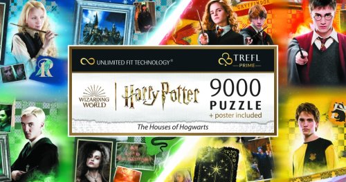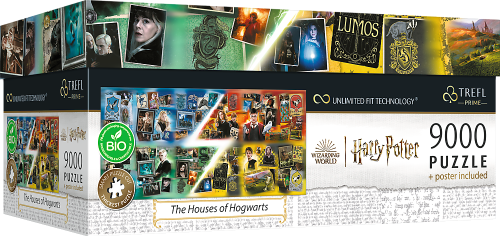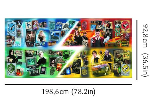 Nutnosť pre všetkých veľkých fanúšikov Harryho Pottera - koláže najznámejších postáv, udalostí a predmetov zo všetkých štyroch bradavických koľají: Chrabromil, Slizolin, Havraspár a Mrzimor. Každý obrázok je balený samostatne (6x1500 dielikov). Vďaka technológii TREFL Unlimited Fit Technology (UFT), ktorá umožňuje spojenie jednotlivých obrázkov medzi sebou, môžete vytvoriť ľubovoľnú kompozíciu obrázkov alebo sa držať rozmiestnenia podľa predlohy. Rozmer zloženého puzzle: 198,6 × 92,8 cm Rozmer balenia: 45 x 24 x 21 cm Vhodné od 12 rokov