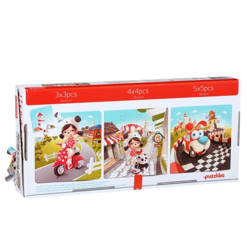 Puzzlika, nová značka puzzlov s moderným kreatívnym designom, prináša pre malé deti aktívne učenie formou zábavnej hry. Obrázkové puzzle Šťastné príbehy 3 v 1 obsahuje 50 veľkých pevných puzzlov, z ktorých poskladáte 3 samostatné obrázky veľkosti 25 x 25 cm, vždy však z iného počtu dielikov (3x3, 4x4, 5x5). Puzzle je skvelá hra pre malé deti, ktorá u nich rozvíja logické myslenie, predstavivosť, kreativitu, jemnú motoriku a rôzne poznávacie znalosti. Puzzle sú vyrobené z veľmi pevného viacvrstvového kartónu s lesklým povrchom. Kartón bol vyrobený z kvalitného, ekologicky pestovaného dreva. Puzzle je možné utrieť vlhkou handričkou. Vhodné pre deti od 3 rokov. Vyrobené v Európe.