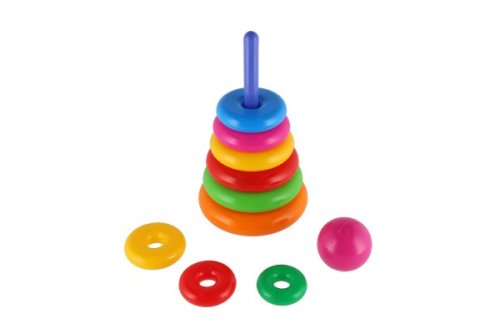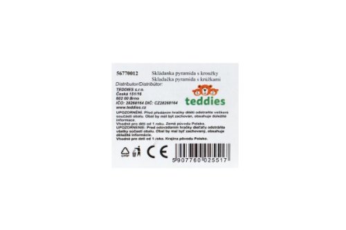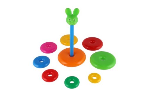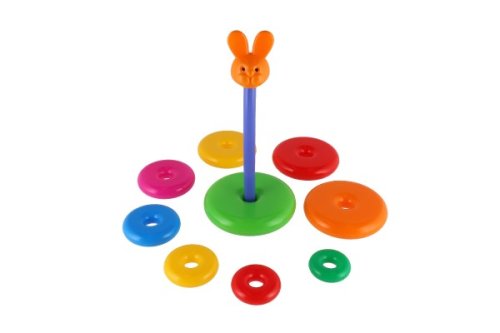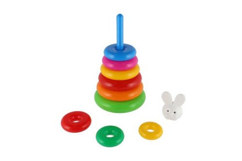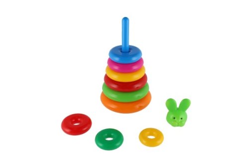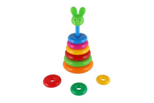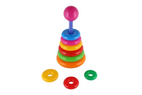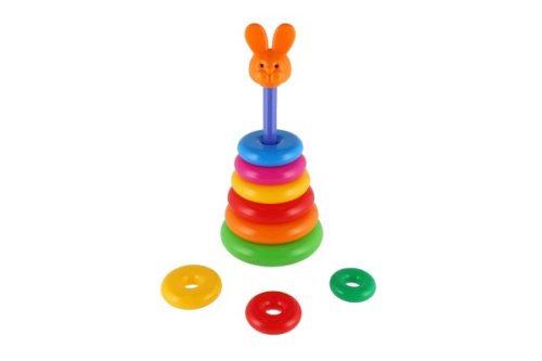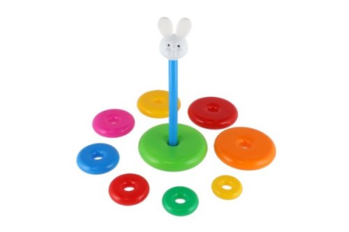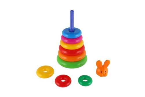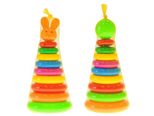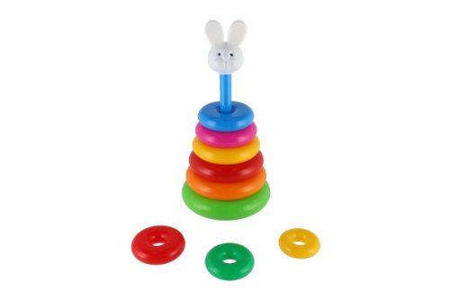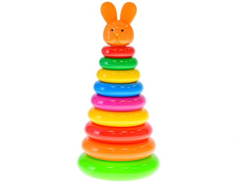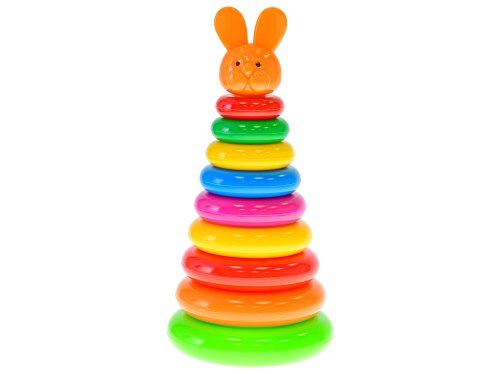 Skladačka pyramída s krúžkami, vďaka ktorej sa deti učia rozoznávať farby a veľkosti. Hračka rozvíja motorické schopnosti dieťaťa a logické myslenie. Pyramída je z mäkkého plastu a je vysoká 30 cm. Dva druhy - zajačik, pyramída.
