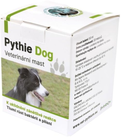 Pythie Dog Veterinárna masť - veterinárna masť je vhodná pri zle sa hojacich nehlbokých ranách, pri drobných kožných a slizničných poraneniach, odreninách, stvrdnutej či šupinatej koži, hmyzím bodnutí, popáleninách a iných drobných poraneniach. Vďaka svojmu zloženiu prispieva k tlmeniu rastu baktérií a plesní a upokojeniu zápalovej reakcie. Používa sa na podporu hojenia a tým jeho urýchlenie, tlmenie svrbenia, vyhladenie jaziev a regeneráciu pokožky psov. Podporuje obnovu a rast srsti. Zloženie: Petrolatum, Silica, Panicum miliaceum, Pythium oligandrum. Návod na použitie: Masť aplikujte na očistenú a navlhčenú pokožku, slabú vrstvu ľahko vmasírujte aj niekoľkokrát denne. Pri aplikácii lieku nepoužívajte žiadne iné prostriedky na ošetrenie kože, okrem prípravkov s Pythium oligandrum . Upozornenie: VETERINÁRNY PRÍPRAVOK – LEN PRE ZVIERATÁ Uchovávajte mimo dosahu detí. Nie je určené na vnútorné použitie. Skladovanie: Výrobok skladovať v suchu pri izbovej teplote 15–25 °C a relatívnej vlhkosti do 40 %.
