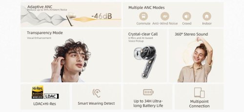 Ponorte sa do sveta krištáľovo čistého zvuku s bezdrôtovými slúchadlami QCY HT08 MeloBuds Pro . Tieto špičkové True Wireless slúchadlá kombinujú pokročilé adaptívne potlačenie hluku (ANC) s Hi-Res Audio kvalitou pre skutočne prémiový posluchový zážitok. S podporou technológie LDAC a 360 ° priestorového zvuku prinášajú 3,5-krát detailnejší zvukový prednes ako bežné slúchadlá.