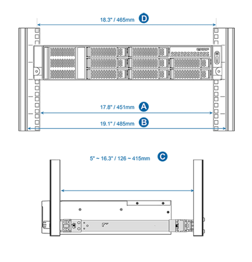 Kompatibilný so serverovými stojanmi so štvorcovými otvormi 9,5 mm x 9,5 mm alebo s okrúhlymi otvormi s priemerom 7,1 mm.