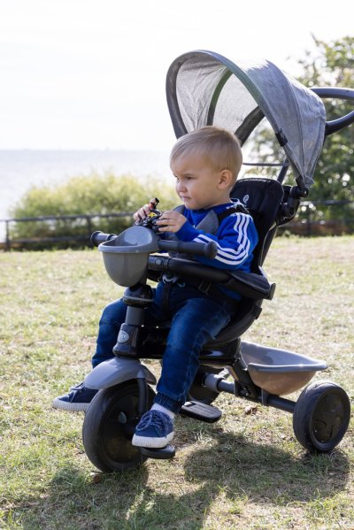 Ako vaše dieťa rastie, môžete meniť opierky na pedále, upravovať alebo odstraňovať rodičovskú rukoväť a opierku chrbta podľa potreby. Trojkolka QPlay Cosy 4 v 1 sa vyvíja v 4 stupňoch, aby sa vášmu dieťaťu ľahšie šliapalo do pedálov.