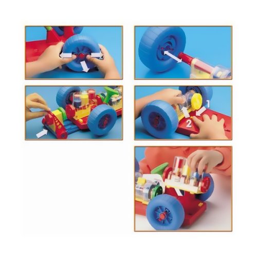Dômyselná hračka, ktorá priamo nabáda deti aj ich rodičov k zisteniu, ako také skutočné auto funguje. Všetky základné mechanické funkcie sú tu presne reprodukované. Pri motore deti uvidia, ako pracujú valce a kľukový hriadeľ a ako sú spojené s prevodovkou, ktorá má funkčné radenie s 3 polohami (neutrál, 1. a 2. stupeň). Diferenciál prenáša pohyb na zadné kolesá a umožňuje ich otáčanie nezávisle na sebe. Všetky mechanické časti je možné ľahko pripojiť k podvozku a rovnako tak je možné ich uvoľniť špeciálnymi odpruženými žltými tlačidlami. Volant funguje a umožňuje autu zatáčať alebo zachádzať do parkoviska. Deti môžu auto tiež vpredu a vzadu zdvihnúť pomocou špeciálnych vozíčkov a otáčaním kľučky pri prednom z nich uvádzať celý mechanizmus do pohybu. Pri radení jednotlivých rýchlostných stupňov uvidí, ako sa bude meniť rýchlosť pohybu kolies a valcov. Pri zaradení neutrálu si tiež všimnú, ako sa motor a diferenciál navzájom odpoja. Určené deťom od 3 rokov. Hlavné vlastnosti: základné mechanické funkcie sú reprodukovanéfunkčný volant a mechanické častipre deti od 3 rokov