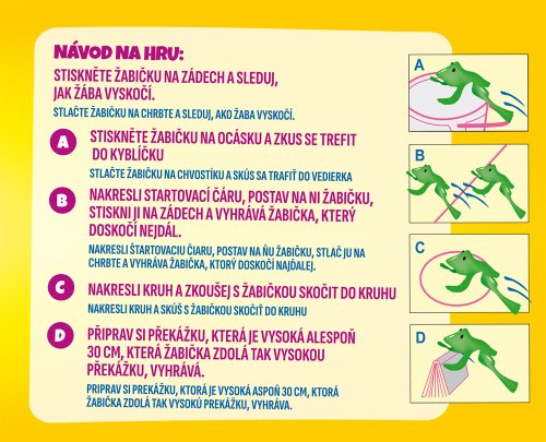 Sada žabičiek, ktoré sa chcú dostať do cieľa. Skákajúce žabky sú novou verziou známej hry blchy, ktorá vyžaduje od hráčov obratnosť, chytrosť a zapojenie, zároveň prináša veľa zábavy! Ideálny spôsob, ako stráviť voľné popoludnie v rodinnom kruhu a zasmiať sa do sýtosti.