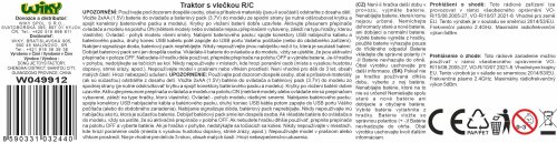 Traktor RC na diaľkové ovládanie. Veľkosť 24 cm. Frekvencia 2.4GHz. Batériový pack 3.7V do traktora súčasťou, 2xAA do ovládača nie sú súčasťou. USB kábel súčasťou. Prepínač ON/OFF na spodnej strane traktora.