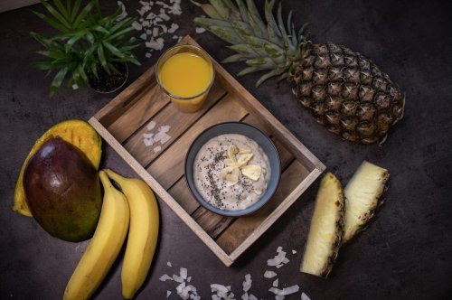 instantná ryžová kaša instantná CFM WHEY proteínový koncentrát ovsené bezlepkové vločky sušené mlieko mix mrazom sušeného ananásu, banánu a manga prášok z mrazom sušeného tropického ovocia strúhaný kokos chia semienka mandle lupienky porciu získaš z odporúčaného denného príjmu: