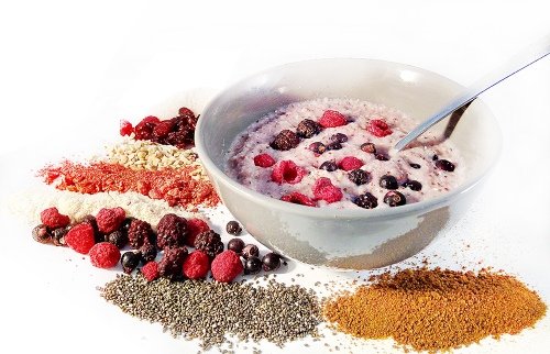 instantná ryžová kaša instantná CFM WHEY proteínový koncentrát ovsené bezlepkové vločky sušené mlieko bio raw kakaový prášok mrazom sušený banán strúhaný kokos chia semienka sušené višne lieskové oriešky kokosový cukor psyllium