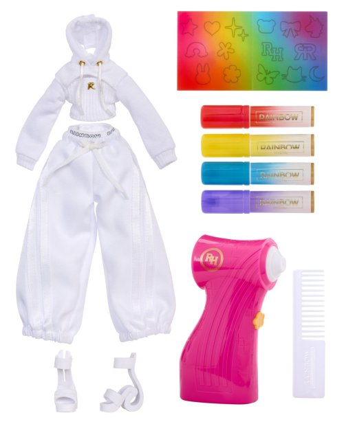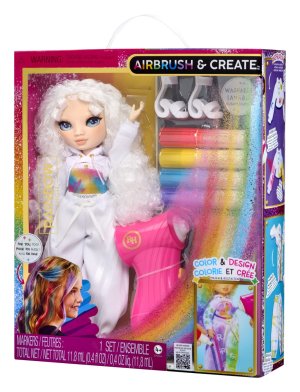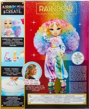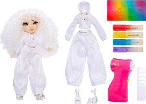 Cieľom Rainbow High je podporovať kreativitu a sebavedomie prostredníctvom farieb. Predstavujeme nový spôsob, ako farebne štylovať bábiku, ktorú môžeš upraviť podľa svojej fantázie. Bábika je celá biela, od hlavy až po päty, čo ti umožní ľahko vytvárať farebné variácie a meniť jej outfit alebo účes znova a znova. Môžeš použiť umývateľné fixky z balenia v Airbrush pištoli alebo kresliť priamo na oblečenie a vlasy. Potom stačí opláchnuť a opakovať. Znova a znova.