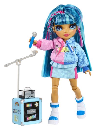 Obsah sady: 1 x bábika Rainbow High Junior Rock Band Skyler (cca. 22 cm), 1 x dvojdielne oblečenie, 1 x topánočky, 1 x mikrofón, 1 x zosilňovač, 1 x samolepky, 1 x hrebeň Zozbieraj ostatné bábiky RH Junior Rock Band (predávajú sa samostatne) a zábava nebude